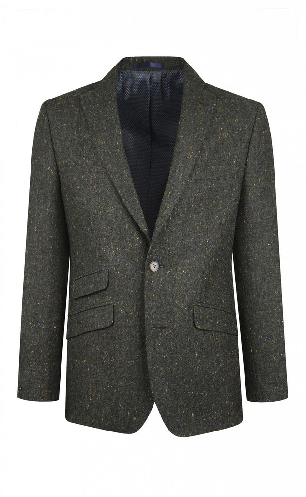 Dark green Donegal tweed jacket with distinctive flecks. Classic, durable, and versatile for country or smart casual wear.