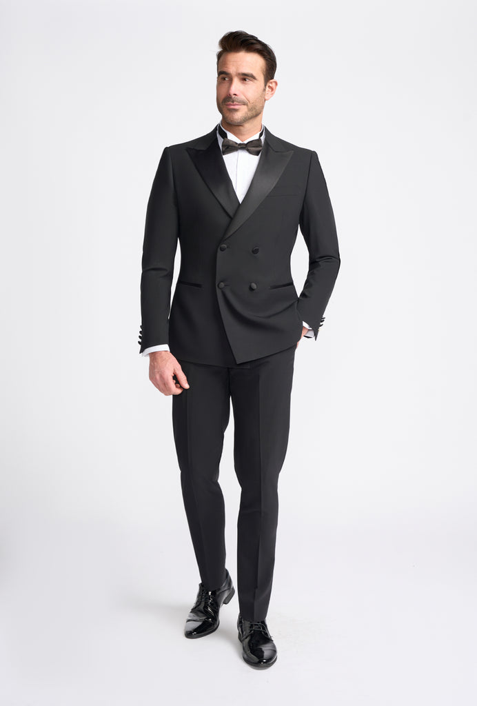 This classic double breasted tuxedo, expertly tailored for the discerning gentleman. Featuring a timeless notch collar and impeccable black finish, this sophisticated piece exudes refined elegance for formal occasions. The included slim fit dress trousers provide a contemporary silhouette that complements the jacket's structured design. Perfect for black-tie events, galas, and milestone celebrations, this tuxedo combines traditional tailoring with modern proportions for an unforgettable impression.